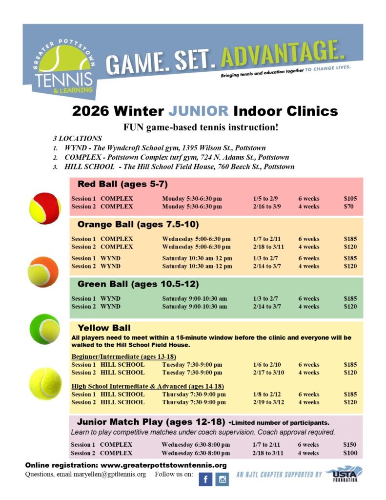 Sign up for fun game-based tennis lessons. GPTL mentors youth development, not just player development. Our coaches mentor tennis instruction for all ages and levels through a pathway of Red Ball, Orange Ball, Green Ball, and Yellow Ball where students learn the skills and strategies to play tennis. Outdoor sessions at the Maple St. Park tennis courts are located at 1430 Maple St., Pottstown. Indoor session locations vary.